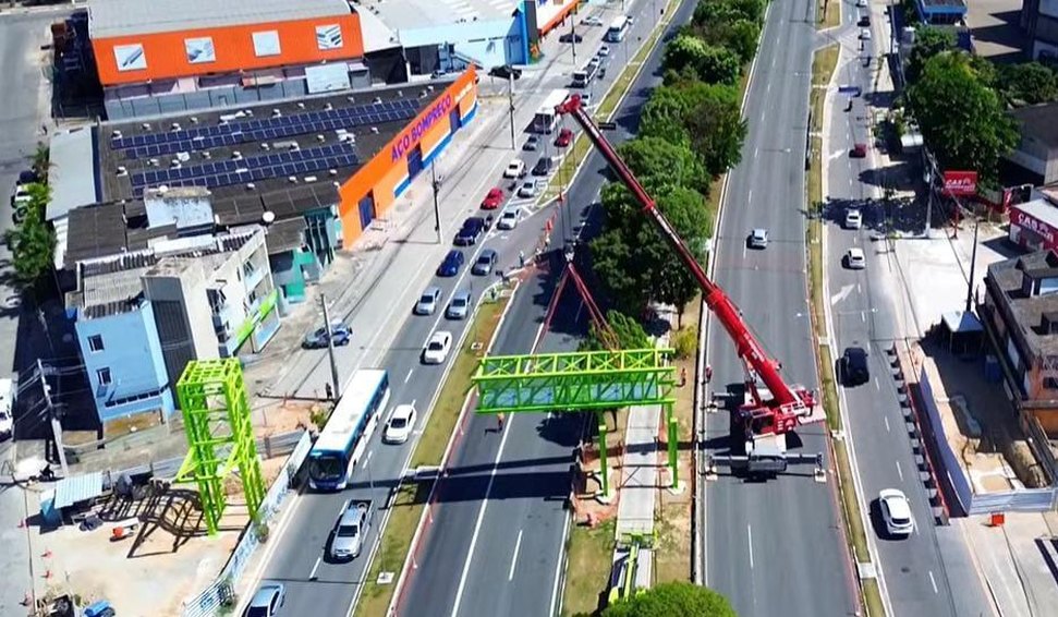 A montagem da passarela utiliza o método de construção industrializado, com módulos fabricados fora de Maceió. Esta será a segunda peça instalada na estrutura superior da passarela.