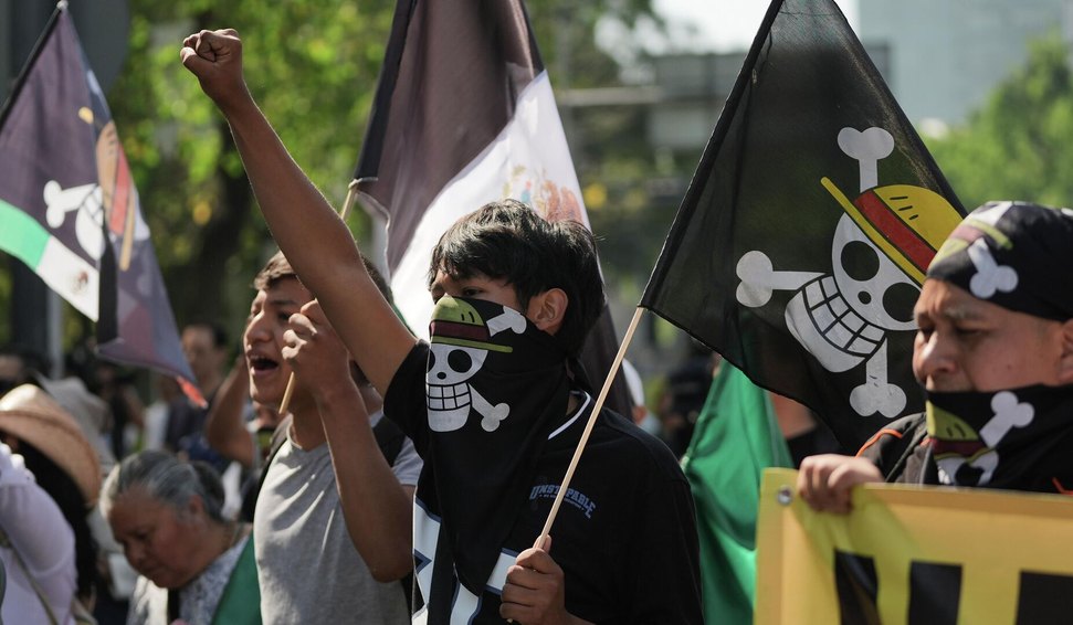 A bandeira já foi usada em manifestações no Peru, na Espanha e na França, mas ficou marcada como um símbolo no Nepal. Desta vez, na Cidade do México, a referência ao mangá esteve novamente presente.