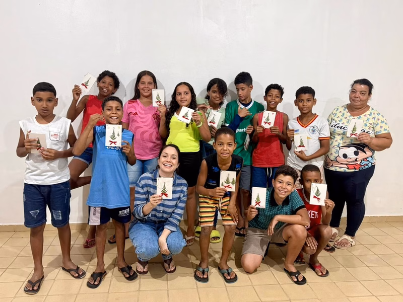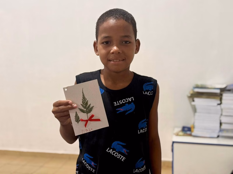 Nas escolas, Olga desenvolve a produção de cartões natalinos feitos com arte botânica, utilizando folhagens que remetem à árvore de Natal. O objetivo é permitir que cada aluno crie um cartão para presentear familiares e amigos, levando uma mensagem de fé e esperança para o período natalino.
