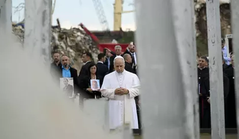 Leão XIV fez uma oração em silêncio no Porto de Beirute e depositou uma coroa de flores em homenagem às vítimas. Em seguida, cumprimentou parentes de pessoas mortas na explosão, que exibiram fotos de seus entes queridos ao pontífice americano.