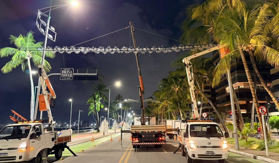 A Prefeitura de Maceió está na fase final de preparação para o Natal de Todos Nós 2025. Na noite desta quarta-feira (4), equipes da Autarquia Municipal de Iluminação Pública realizaram intervenções na Avenida Sílvio Carlos Viana, no bairro da Ponta Verde, após as 22h. Foram instaladas estruturas metálicas que servirão de suporte para arcos de luz e painéis luminosos, cruzando a principal via da orla.
