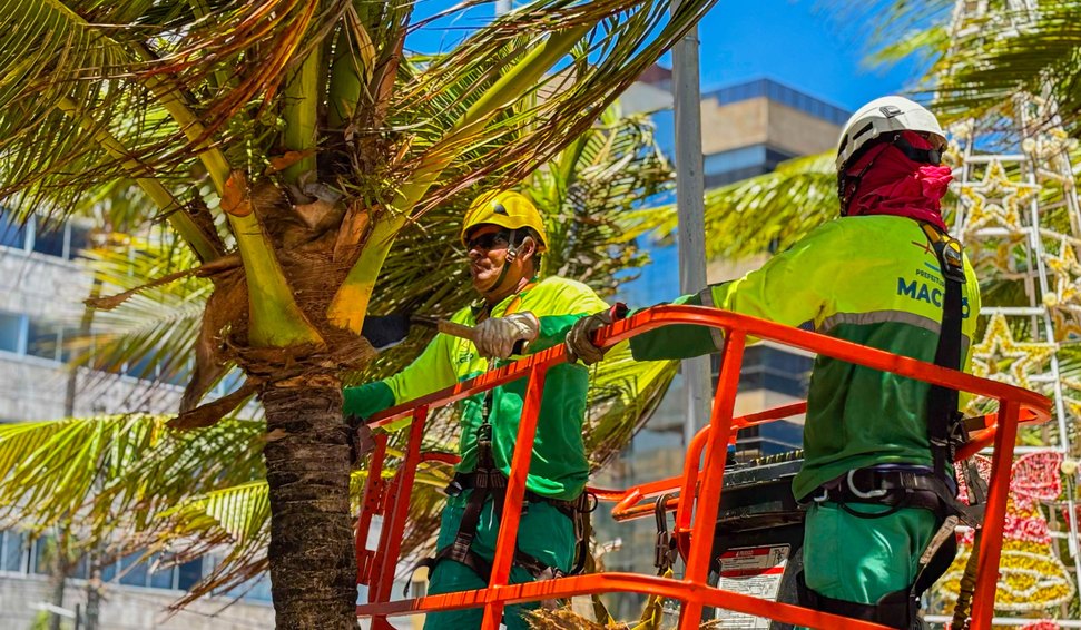 O serviço, que já é realizado diariamente, será reforçado durante o período de maior fluxo de visitantes. As equipes de poda atuarão em dobro, percorrendo toda a extensão da orla para retirar frutos e palhas secas dos coqueiros, reduzindo riscos de quedas.