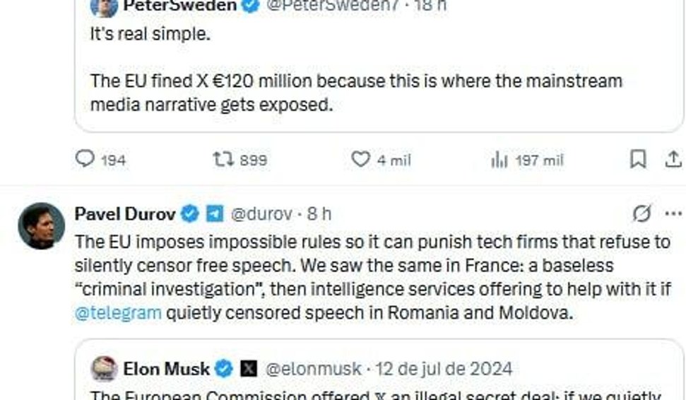"A UE introduz regras impossíveis para poder punir empresas tecnológicas que recusam censurar silenciosamente a liberdade de expressão", declarou Durov. Ele citou ainda a investigação que ocorre na França contra o Telegram, destacando que a plataforma poderia ser "ajudada" por serviços especiais de Paris, em troca de censura silenciosa contra eurocéticos na Romênia e Moldávia.