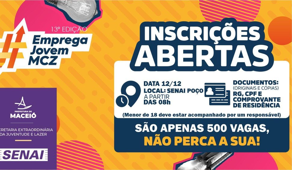 A Prefeitura de Maceió, em parceria com o Senai, inicia nesta sexta-feira (12) as inscrições para a 13ª edição do Programa Emprega Jovem. Coordenada pela Secretaria Extraordinária da Juventude e Lazer (SEJL), a iniciativa oferece 500 vagas em cursos gratuitos destinados à formação e qualificação profissional de jovens e adultos maceioenses, ampliando as oportunidades de inserção no mercado de trabalho.