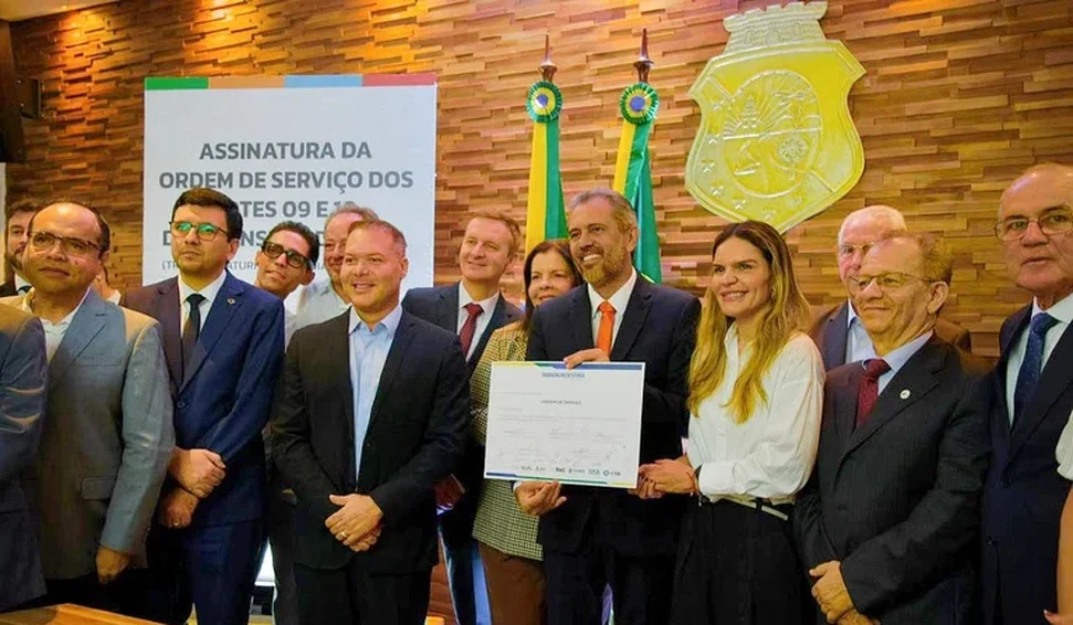 O ministro da Integração e do Desenvolvimento Regional, Waldez Góes, é um dos signatários da ordem de serviço entregue durante a cerimônia no Palácio da Abolição, em Fortaleza. O documento contou ainda com as rubricas do governador do estado, Elmano de Freitas; do CEO da Transnordestina Logística S/A, Tufi Daher Filho; do secretário Nacional de Transporte Ferroviário do Ministério dos Transportes, Leonardo Cezar Ribeiro; e do diretor do Grupo Agis Construção S.A, José Lima da Silva Júnior.