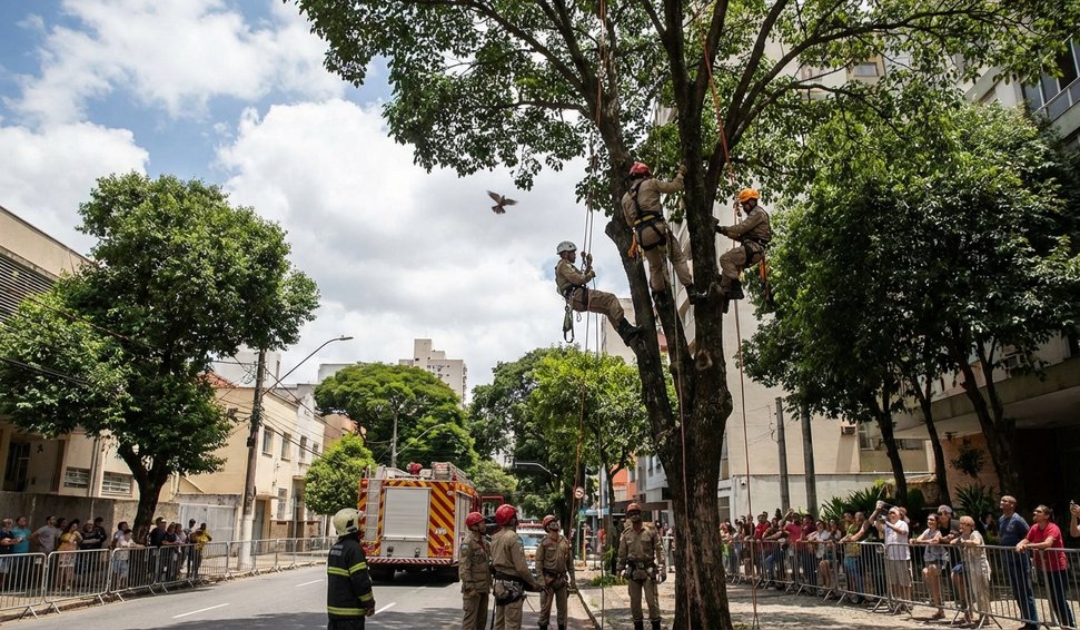 Um resgate inusitado mobilizou o Corpo de Bombeiros em Belo Horizonte nesta segunda-feira (data não informada): um pombo ficou preso em uma linha de pipa no topo de uma árvore, exigindo uma operação especial dos militares do 1º Batalhão.