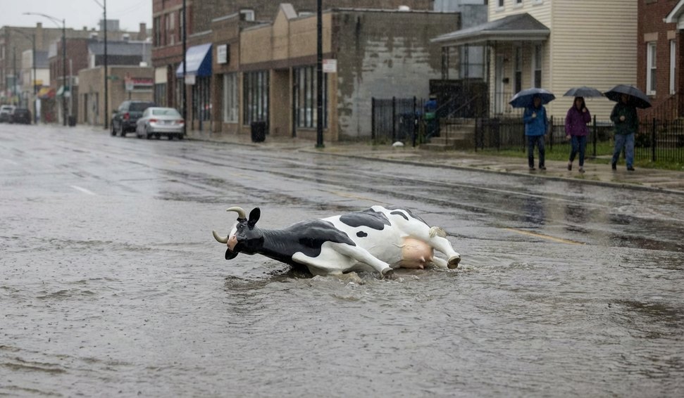 Objeto decorativo é levado pela correnteza após alagamento causado por temporal; cena inusitada viraliza nas redes sociais.