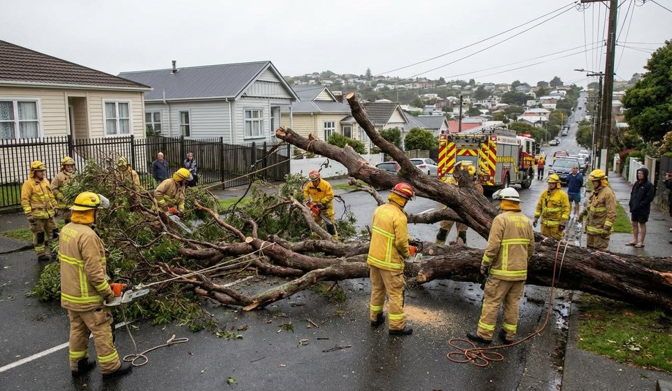 Equipe do Corpo de Bombeiros atua para remover árvore de 15 metros que bloqueou acesso a residências em Belo Horizonte.