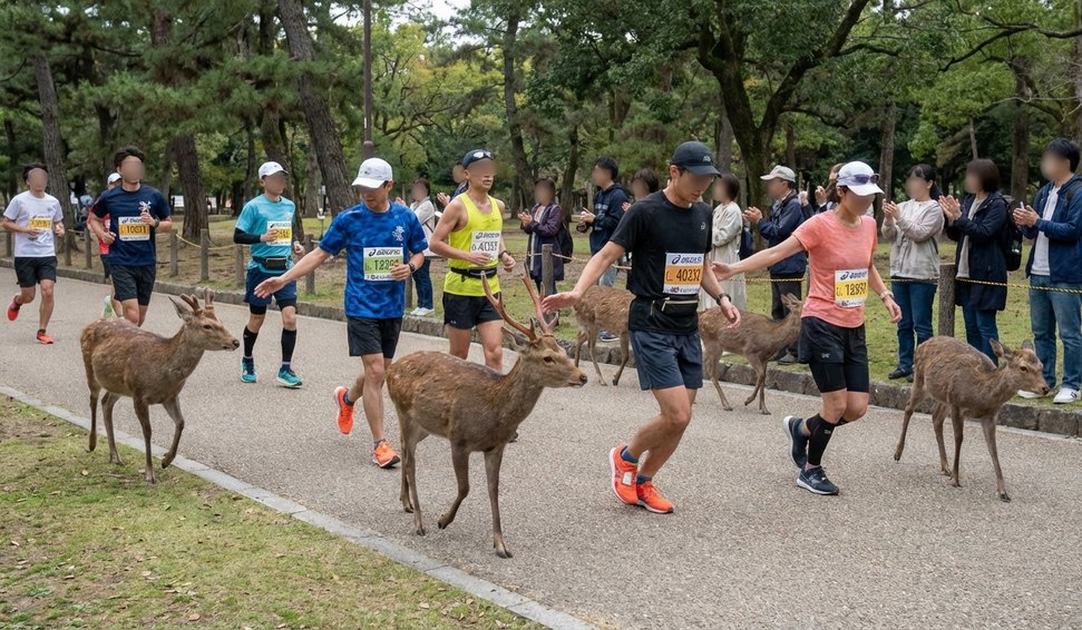 Animais sagrados de Nara interagem com corredores e encantam público durante tradicional maratona japonesa.