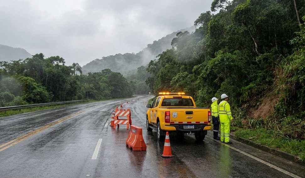 Concessionária RioSP alerta para possibilidade de bloqueios em trechos da BR-101 devido ao alto volume de chuva; equipes estão mobilizadas para garantir a segurança.