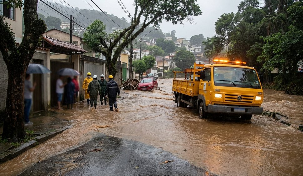 Temporal provoca alagamentos, deixa desaparecidos e obriga suspensão de aulas em Petrópolis. Defesa Civil emite alerta extremo.