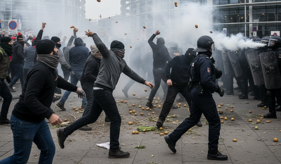 Bruxelas — Um protesto de agricultores em frente ao Parlamento Europeu terminou em confronto nesta terça-feira, na capital belga. Imagens registradas por testemunhas mostram o momento em que manifestantes lançaram batatas e outros objetos contra as forças de segurança, que responderam com gás lacrimogêneo para dispersar o grupo.