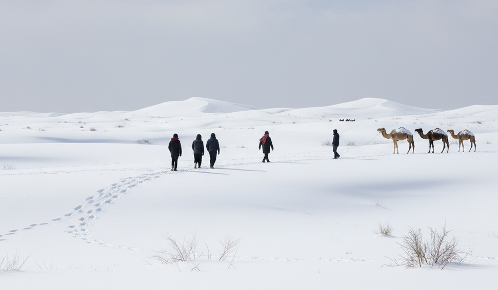 Nevasca surpreendente transforma paisagens desérticas sauditas e chama atenção para extremos climáticos na região.
