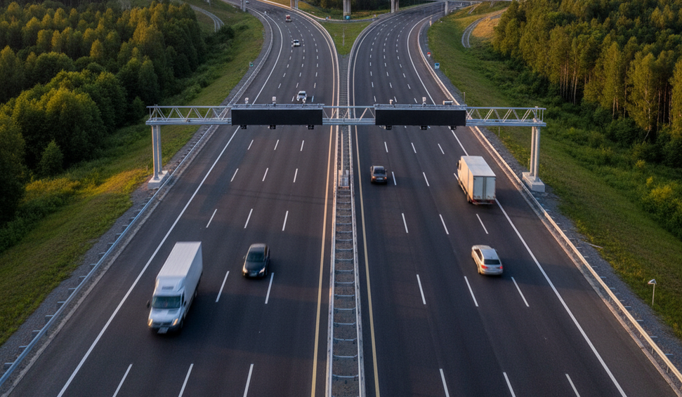 O veículo passa livremente pelo pórtico, sem precisar parar ou reduzir a velocidade.