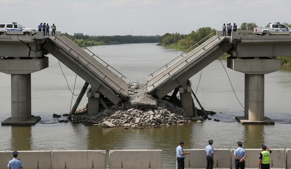 Ponte desaba no Cazaquistão sem deixar vítimas. Uma ponte rodoviária desabou nesta quinta-feira (18) sobre o rio Keles, no Cazaquistão. Felizmente, não houve feridos. As autoridades locais informaram que uma rachadura na estrutura foi detectada a tempo, o que permitiu o bloqueio imediato do tráfego antes do colapso total.