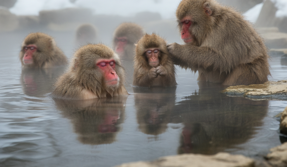 Você sabia? Os macacos-japoneses ficaram famosos por se aquecerem em fontes termais durante o inverno. Segundo a lenda, tudo começou de forma inusitada: uma macaquinha teria caído acidentalmente em uma dessas águas quentes enquanto buscava comida e, ao perceber o conforto, resolveu permanecer ali. As demais, ao observarem sua expressão de relaxamento, não resistiram e pularam também. Desde então, os banhos termais se tornaram uma tradição entre o grupo.
