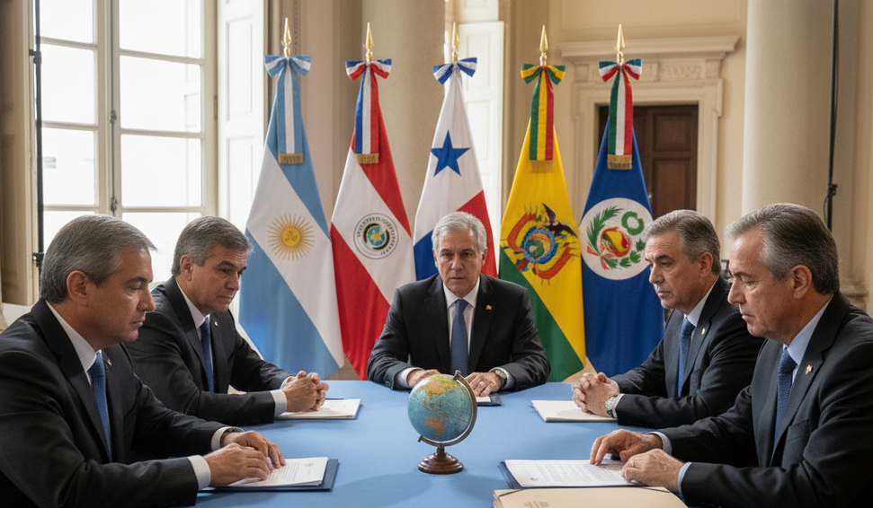 Argentina, Brasil, Paraguai, Uruguai e Bolívia são Estados Partes do Mercosul. Equador, Panamá e Peru participam como Estados Associados.