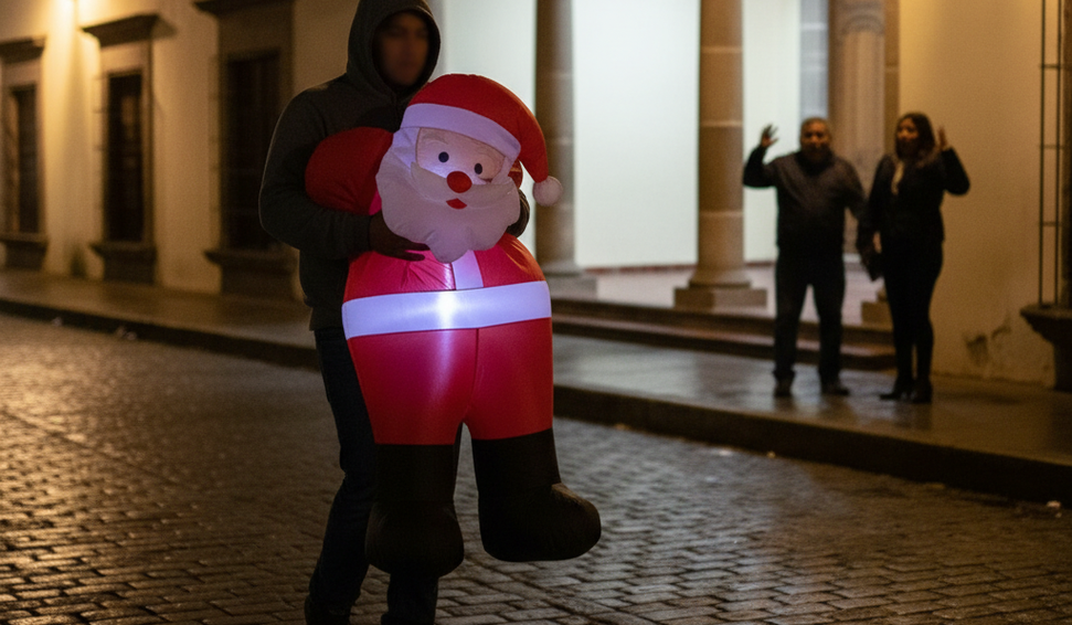 Em Puebla, criminoso é flagrado levando Papai Noel inflável e surpreende moradores ao agir com tranquilidade.