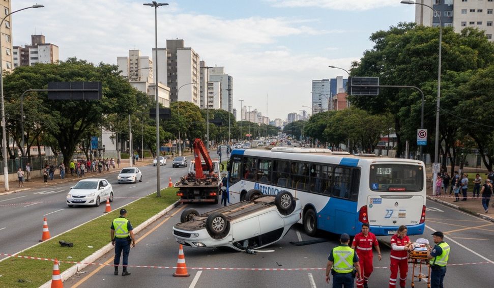 Colisão com ônibus faz carro capotar e interdita avenida em MG