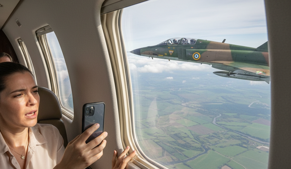 Um vídeo que circula nas redes sociais mostra o momento em que um caça da Força Aérea Brasileira (FAB) se aproxima, em pleno voo, de um avião particular. As imagens, publicadas nesta terça-feira, 23, por uma passageira da aeronave, registram a manobra de aproximação do F-5, que logo em seguida se afasta.