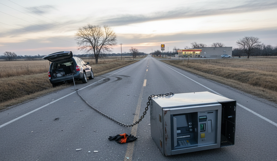Durante a fuga, o equipamento se soltou do veículo e foi encontrado abandonado na estrada, conforme informou a CBS. Os suspeitos, vestidos de preto e usando luvas laranja, continuam foragidos. A polícia investiga se o caso tem ligação com outros roubos semelhantes registrados recentemente na região.
