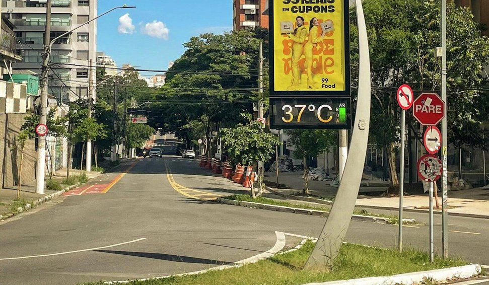 Em bairros como Vila Madalena, termômetros de rua chegaram a registrar marcas próximas a 37 °C durante a tarde.