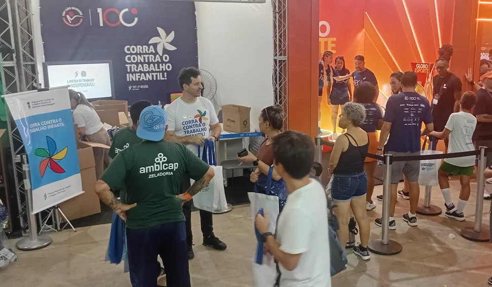 Durante quatro dias (de 27 a 30/12), magistrados(as) e servidores(as) do TRT da 2ª Região marcaram presença em estande da Justiça do Trabalho e distribuíram cerca de 20 mil kits com materiais da campanha “Corra contra o Trabalho Infantil” a participantes da 100ª edição da Corrida Internacional de São Silvestre e demais pessoas. A ação foi desenvolvida no Pavilhão das Culturas Brasileiras, local de retirada dos kits da prova pelos(as) atletas, no Parque do Ibirapuera, em São Paulo-SP. Veja o álbum de fotos do evento.