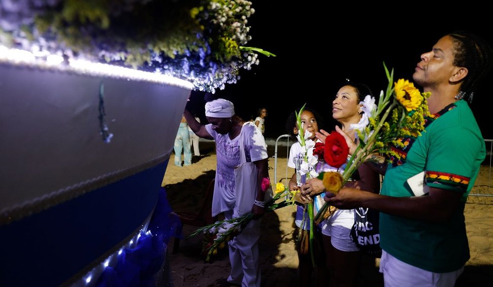 As palmas brancas, rosas amarelas e outras flores levadas à Praia Vermelha podiam ser depositadas, junto com cartas, perfumes e champanhe, em um barco, azul e branco, de cerca de dois metros de comprimento, com a imagem de Iemanjá, e que ornamentava o espaço para a gira na areia da praia organizada pela Associação Umbanda e Cultos Afros (Auca).