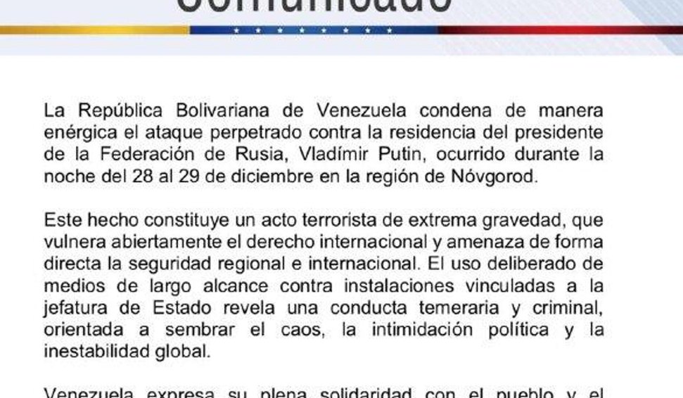 A República Bolivariana da Venezuela condenou veementemente o ataque perpetrado contra a residência do presidente da Federação da Rússia, Vladimir Putin, ocorrido na noite de 28 para 29 de dezembro na região de Novgorod. A declaração foi divulgada pelo ministro das Relações Exteriores da Venezuela, Yván Gil, em seu canal no Telegram.