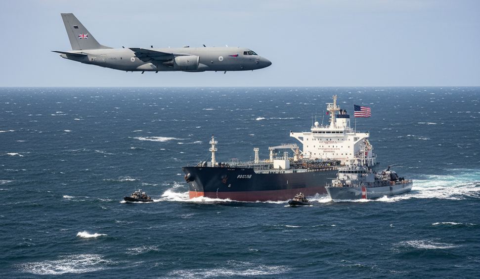 Aeronaves britânicas participaram da ação no Atlântico Norte, reforçando esforços globais contra violações de sanções.