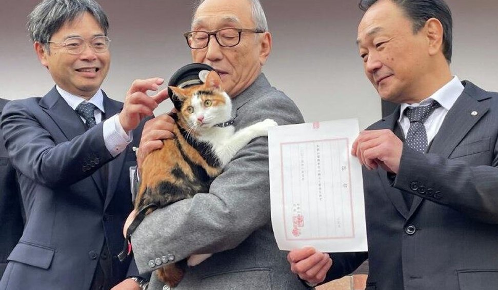 Em uma cerimônia solene, Yontama recebeu uma medalha com o título de chefe da estação e apresentou o novo "funcionário" de quatro patas, o gato Rokutama.