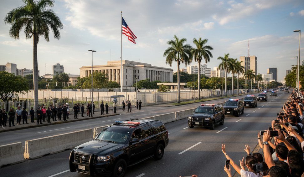 Diplomatas dos Estados Unidos chegaram a Caracas nesta semana, movimentando as redes sociais após usuários divulgarem vídeos de um comboio se dirigindo à embaixada americana, que permanece sob rígido esquema de segurança na capital da Venezuela.