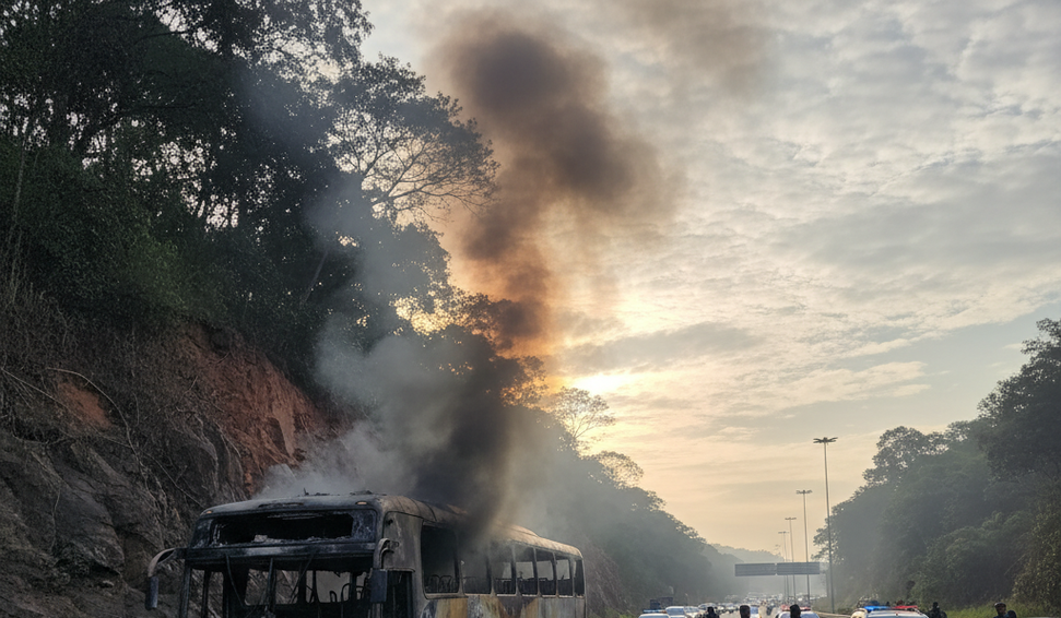 Ônibus em chamas bate em barranco após ser abandonado por motorista e passageiros