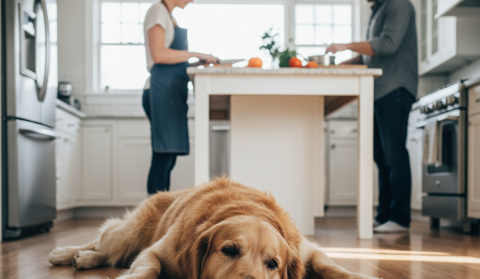 Golden Retriever conquista a internet ao simular sono enquanto observa discretamente os donos na cozinha