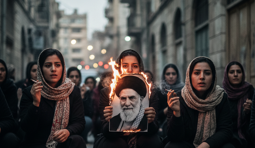 Mulheres estão realizando um novo protesto simbólico contra o regime do Irã, combinando a queima de fotos do líder supremo, aiatolá Ali Khamenei, com o ato de fumar, prática historicamente estigmatizada para mulheres na região. A ação desafia simultaneamente a autoridade do regime e as normas sociais impostas às mulheres, em meio a protestos generalizados no país.