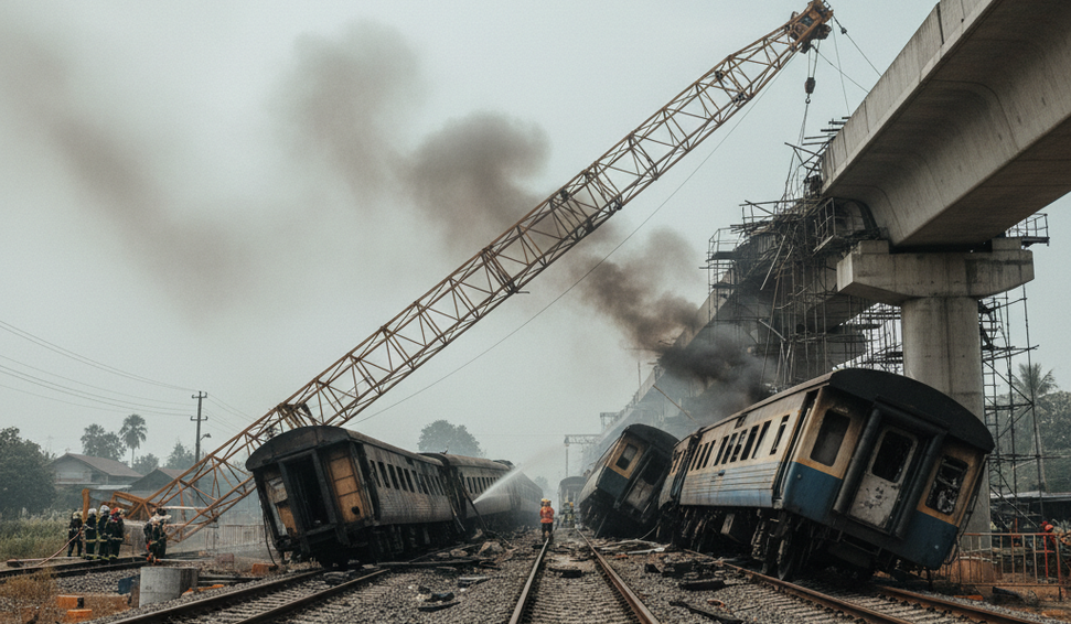 Acidente em Nakhon Ratchasima interrompe obra bilionária e mobiliza equipes de resgate; trem transportava quase 200 pessoas.