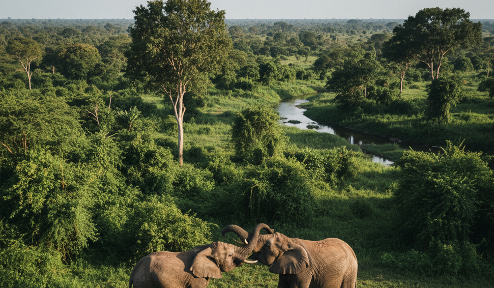 Um drone registrou uma cena rara no Parque Nacional de Virunga, na República Democrática do Congo: dois elefantes foram flagrados interagindo de forma descontraída em meio à natureza exuberante do local.