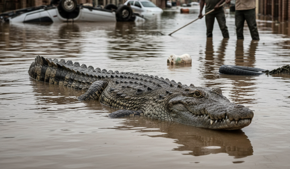 As intensas chuvas que atingem diversas províncias da África do Sul nas últimas semanas têm provocado não apenas inundações, mas também o deslocamento de crocodilos para áreas habitadas.
