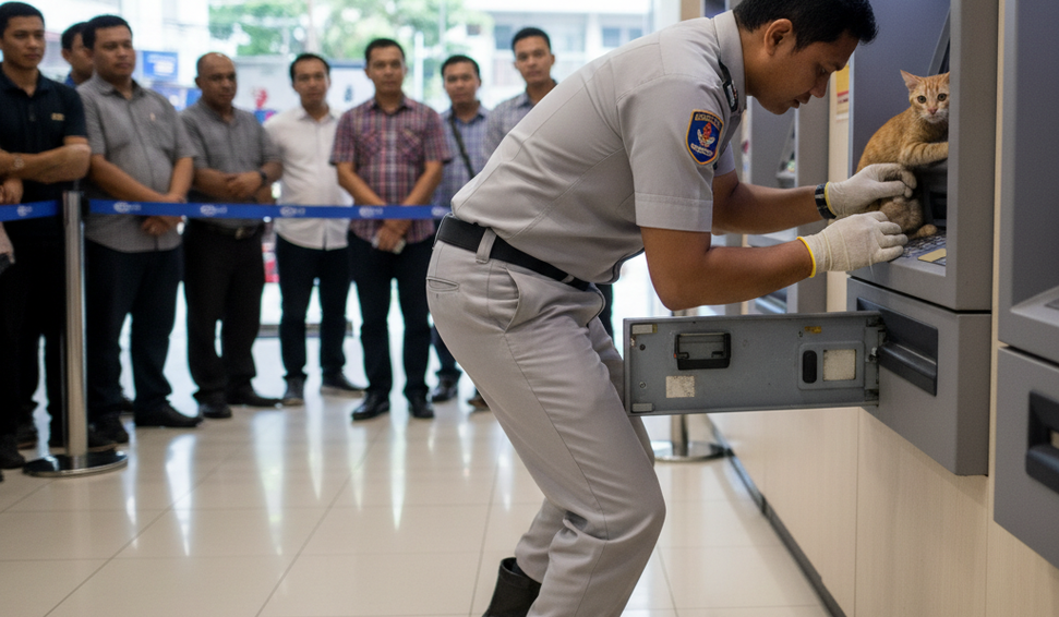 Um gato foi encontrado preso dentro de um caixa eletrônico na Malásia, surpreendendo clientes e funcionários do local. Para realizar o resgate, um agente da Defesa Civil precisou praticamente se espremer pela estreita abertura na parte traseira do equipamento.