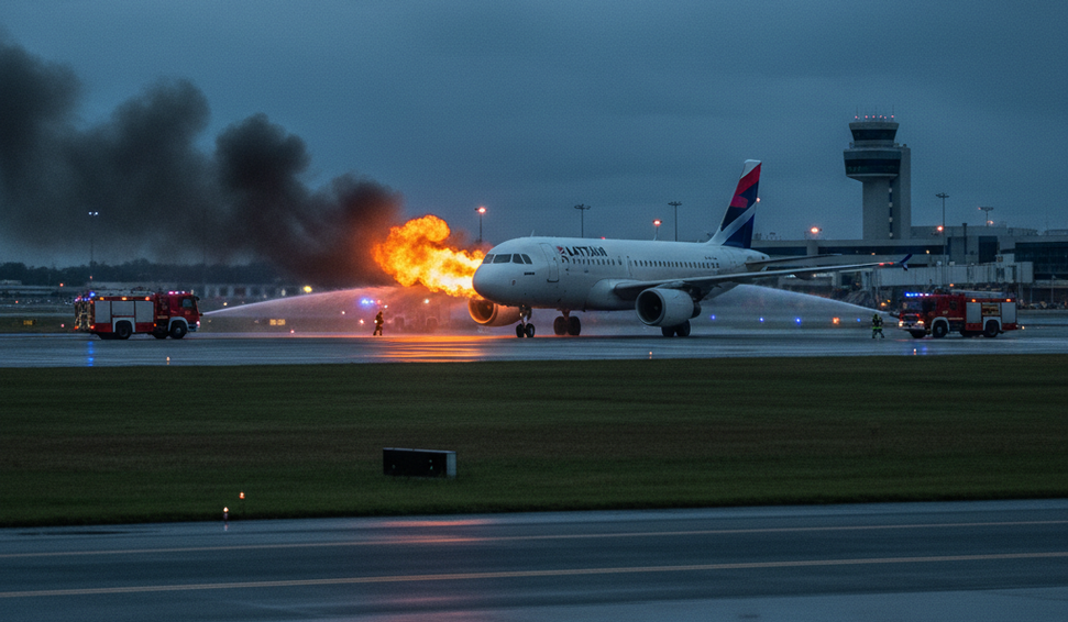 Passageiros relatam momentos de tensão após incêndio em turbina de aeronave da Latam no Aeroporto Internacional de Florianópolis; voo foi cancelado e todos foram realocados.