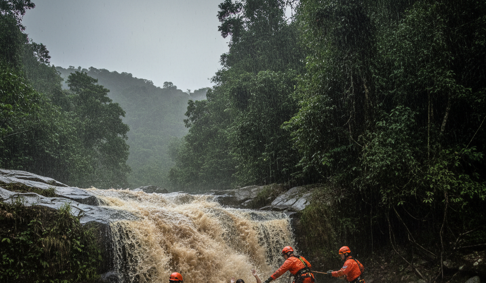 Vítima foi arrastada pela correnteza em cachoeira durante fortes chuvas; bombeiros realizaram o salvamento