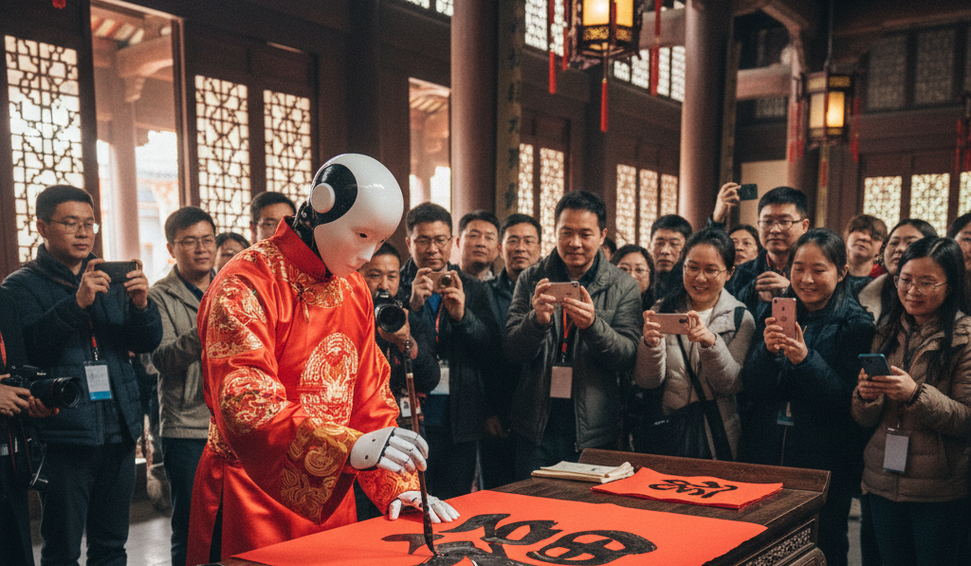 Robô com trajes típicos surpreende ao reproduzir caracteres chineses e atrai multidão em demonstração cultural.