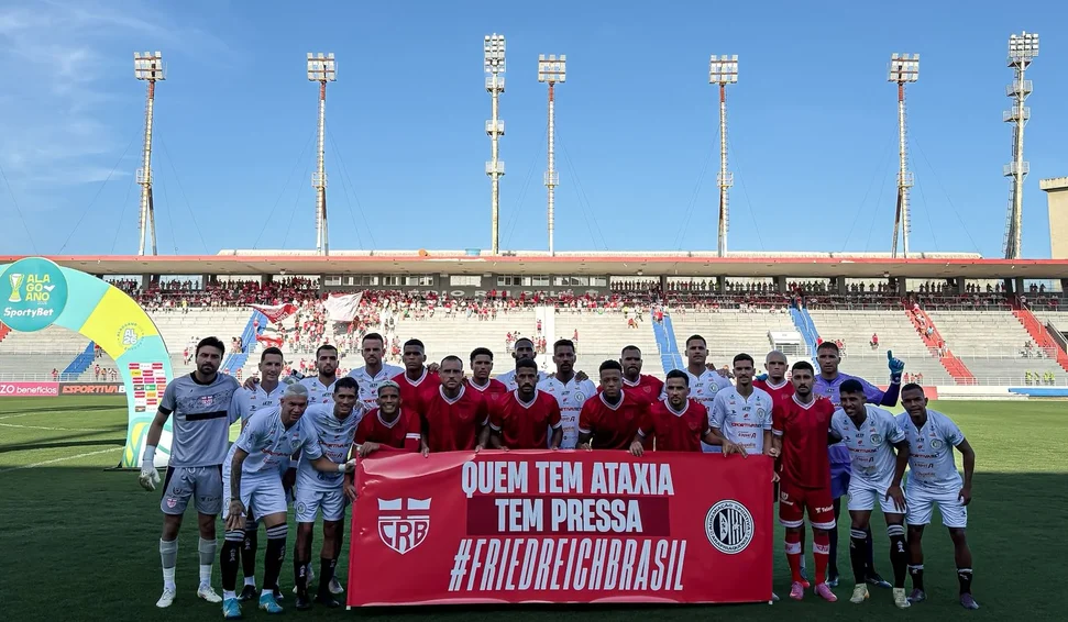Antes da bola rolar no confronto deste sábado (31), entre CRB e ASA, válido pelo Campeonato Alagoano, o futebol deu lugar a um momento de empatia e conscientização. Logo após a execução do Hino Nacional, atletas das duas equipes deixaram de lado a rivalidade e se reuniram no centro do gramado para uma ação solidária em apoio a Lu Sampaio, esposa do atacante Júnior Viçosa, que enfrenta a Ataxia de Friedreich.