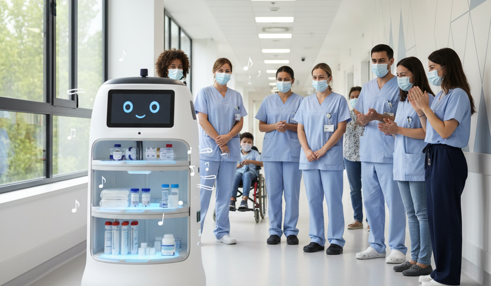 Equipamento automatizado transporta biomateriais ao som de clássico italiano, otimizando rotina hospitalar.