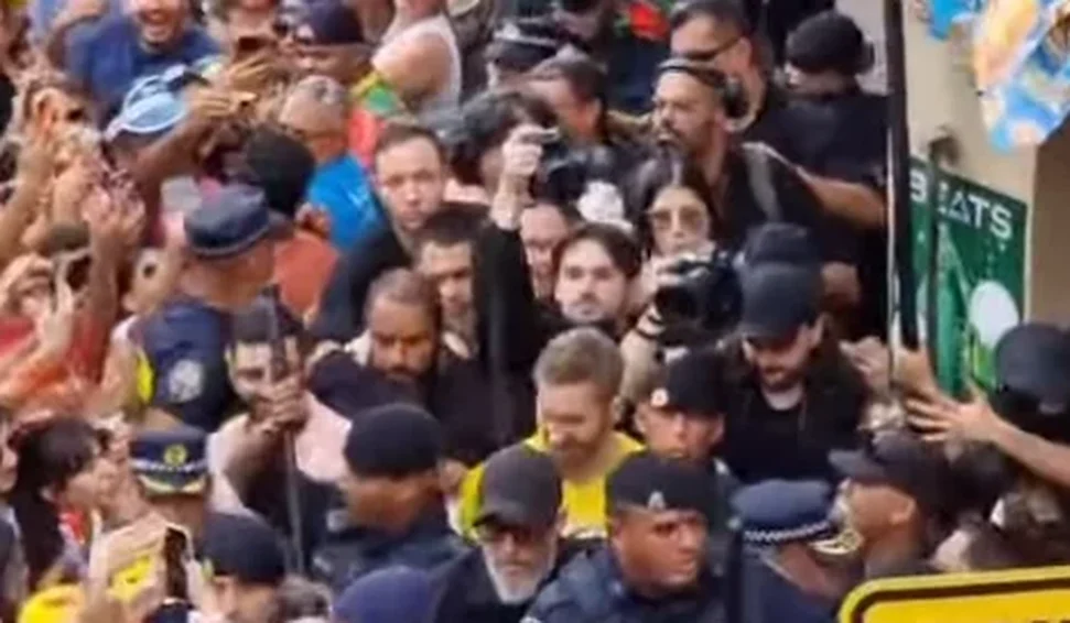 DJ escocês compartilha vídeos da chegada tumultuada ao trio e celebra apresentação no bloco Skol, marcado por empurra-empurra e forte esquema de segurança.
