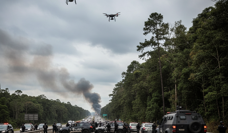 Rodovia ficou fechada após confronto entre suspeitos armados e policiais militares na região de Sorocaba. Dois homens foram presos e buscas continuam com apoio de drones.