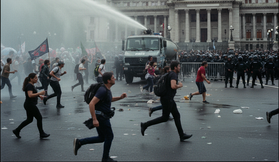 Forças de segurança dispersam protesto com caminhão-pipa nas proximidades do Congresso argentino durante debate sobre reforma trabalhista.