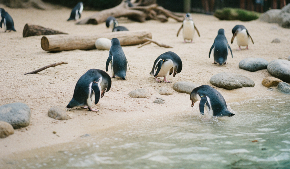 Colônia de pinguins-azuis explora areia e curte clima ameno em Cincinnati, vivenciando ambiente próximo ao natural.
