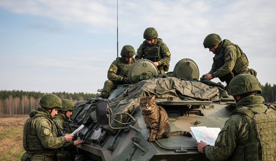 O gato Kuzya chamou atenção ao surgir durante a preparação para combate, sempre ao lado dos soldados russos.
