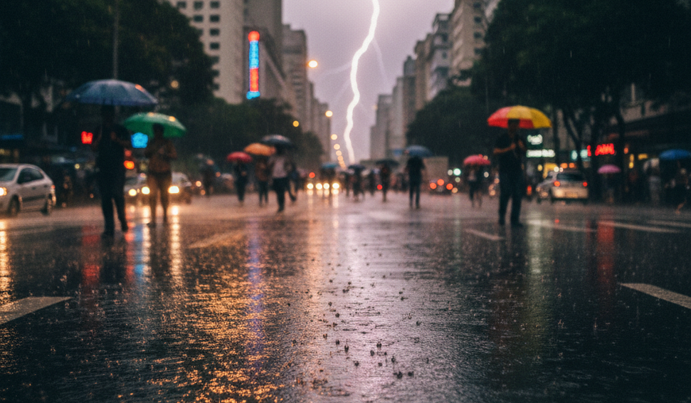 As instabilidades ganham força entre o meio da tarde e o início da noite, provocando pancadas de chuva de intensidade moderada a forte, acompanhadas de raios e rajadas de vento.